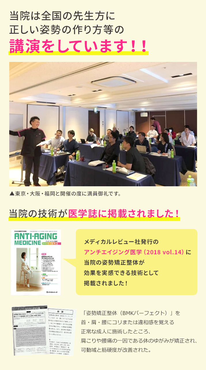 当院の整体法は全国のプロ整体師170人以上が学んでいるボキボキしない施術で、肩こり、腰痛、猫背を始めあなたのお悩みに必ずお応えします!